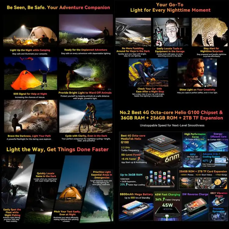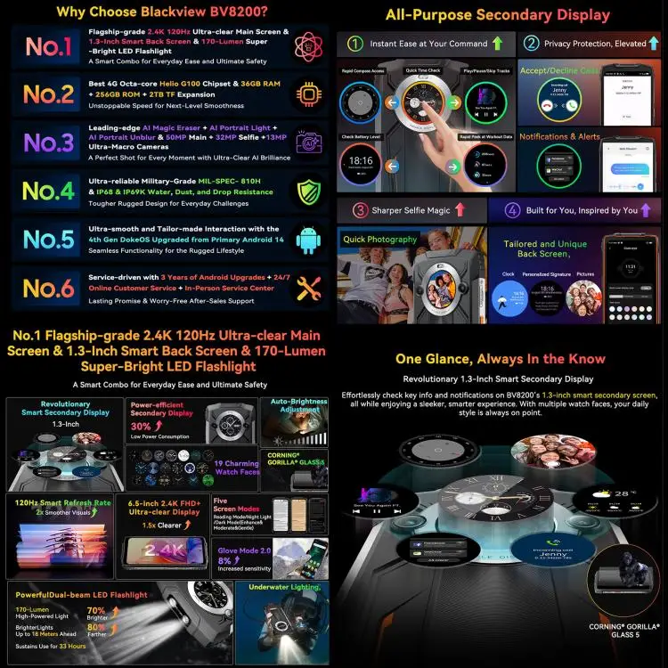 Điện thoại bền bỉ Blackview BV8200, 12GB+256GB, 6,5 inch + 1,3 inch Android 14 MediaTekHelio G100 MT8781, Mạng: 4G, NFC (Đen)