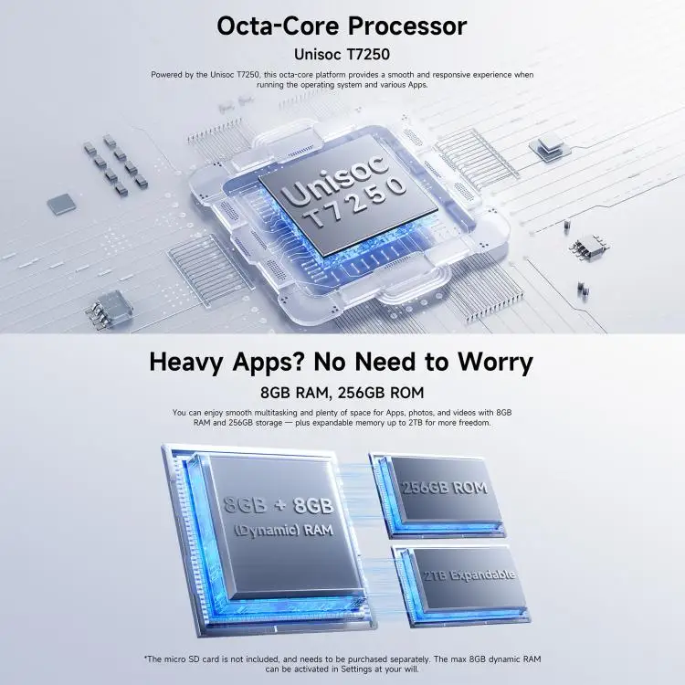 CPU: Unisoc T7250, octa-core, 2 x Arm Cortex-A75 1.8GHz + 6 x Arm Cortex-A55 1.6GHz