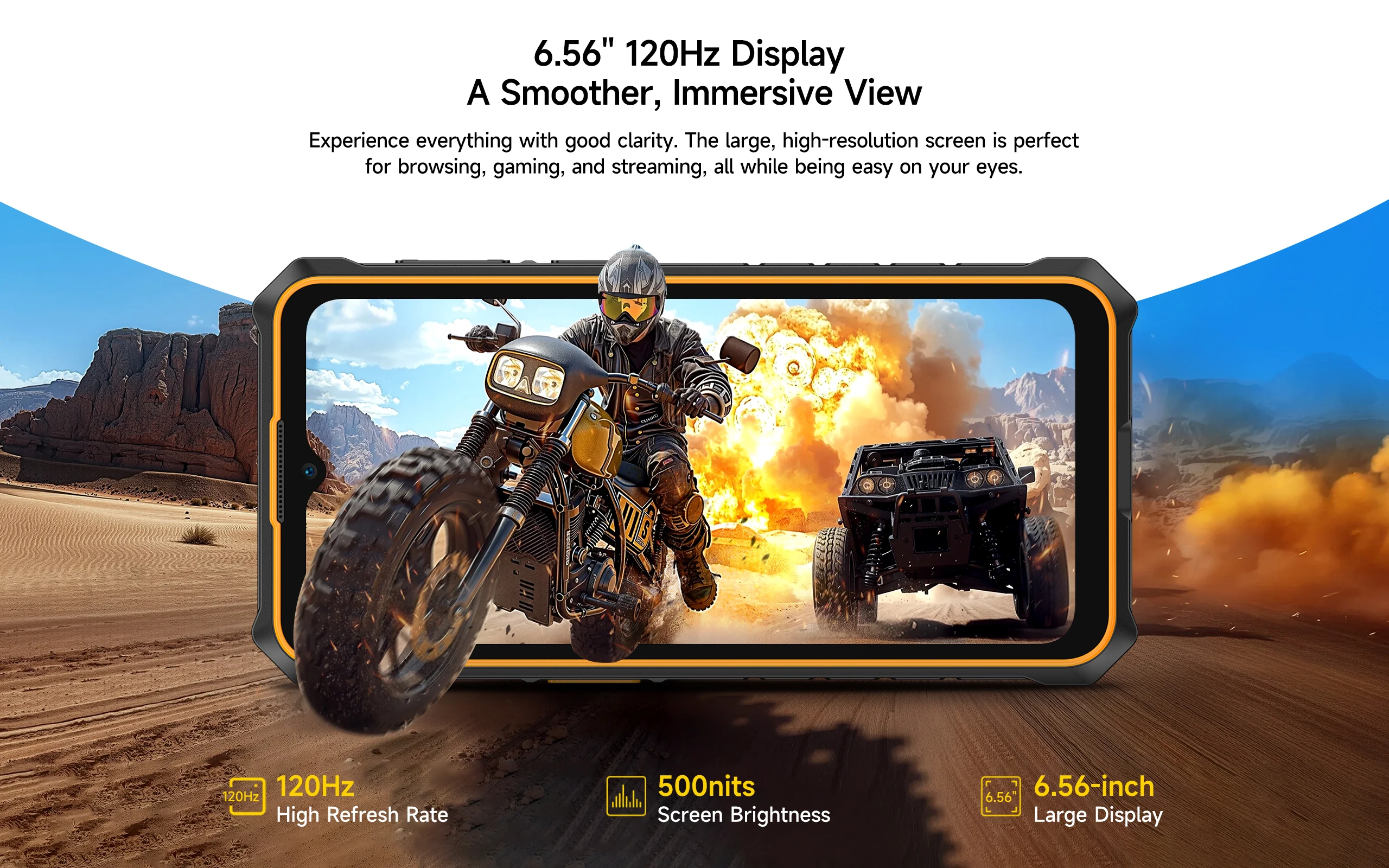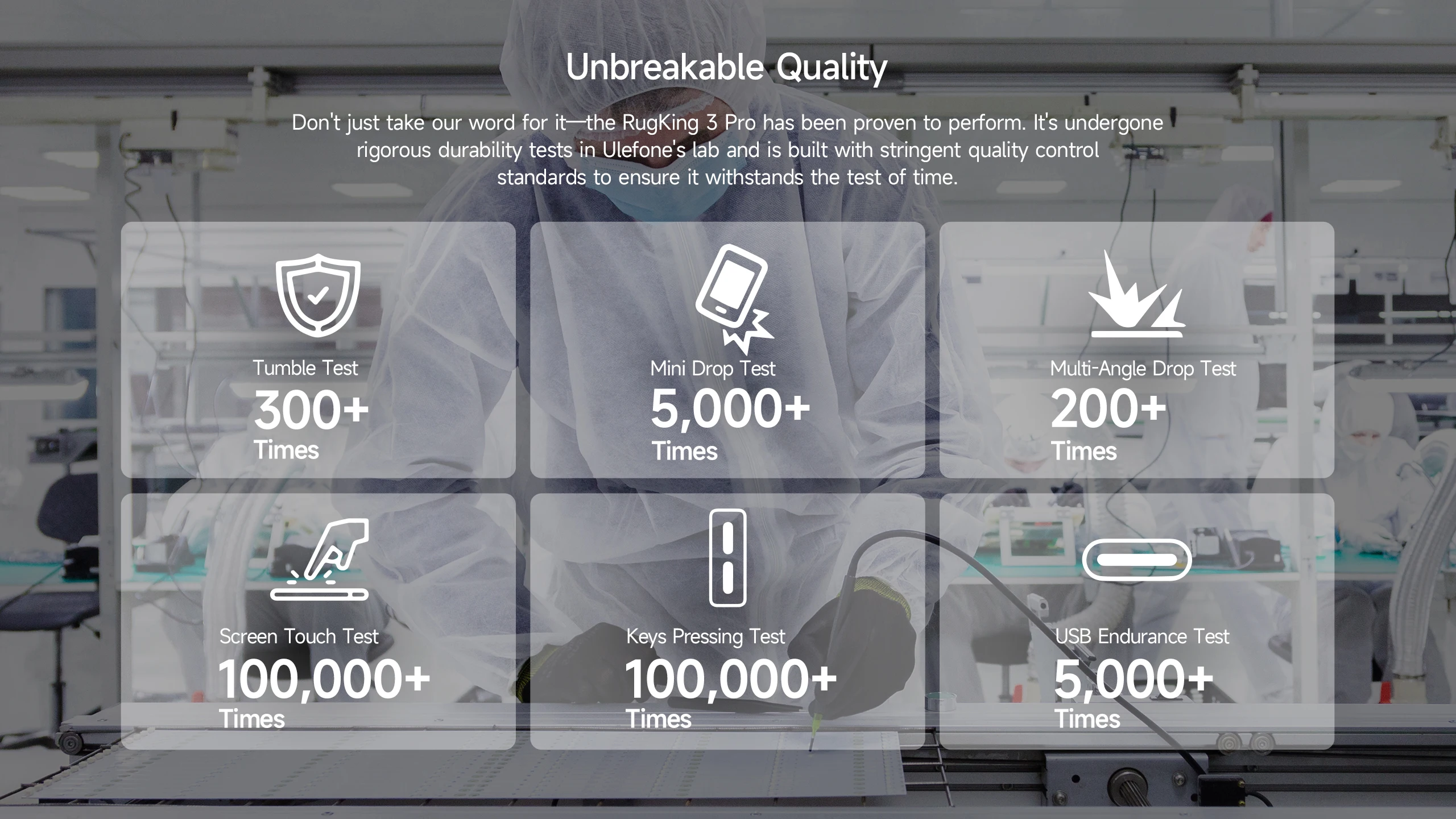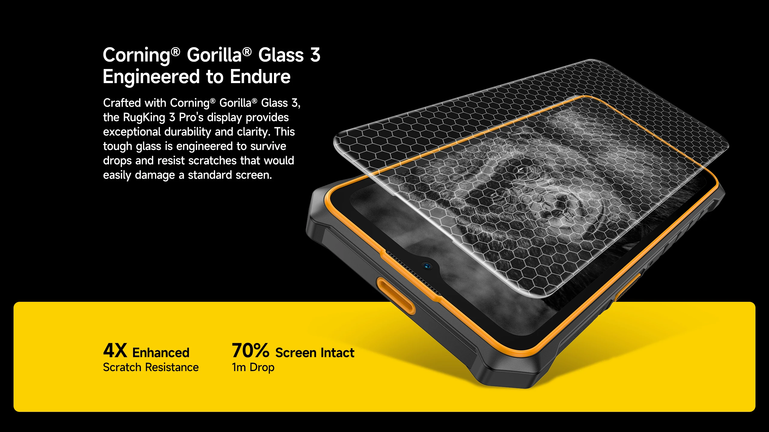 Được chế tạo bằng kính Corning® Gorilla® Glass 3, màn hình của RugKing 3 Pro mang lại độ bền và độ rõ nét vượt trội. Loại kính cứng cáp này được thiết kế để chịu được va đập và chống trầy xước, những điều dễ dàng xảy ra với màn hình thông thường.