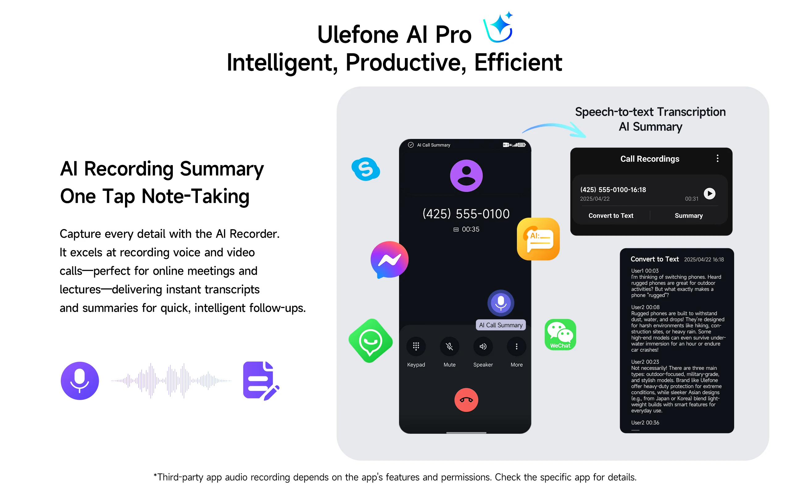 Ghi lại mọi chi tiết với Trình ghi âm AI. Nó hoạt động xuất sắc trong việc ghi âm cuộc gọi thoại và video, lý tưởng cho các cuộc họp và hội nghị trực tuyến, cung cấp bản ghi và tóm tắt tức thì để theo dõi nhanh chóng và thông minh.