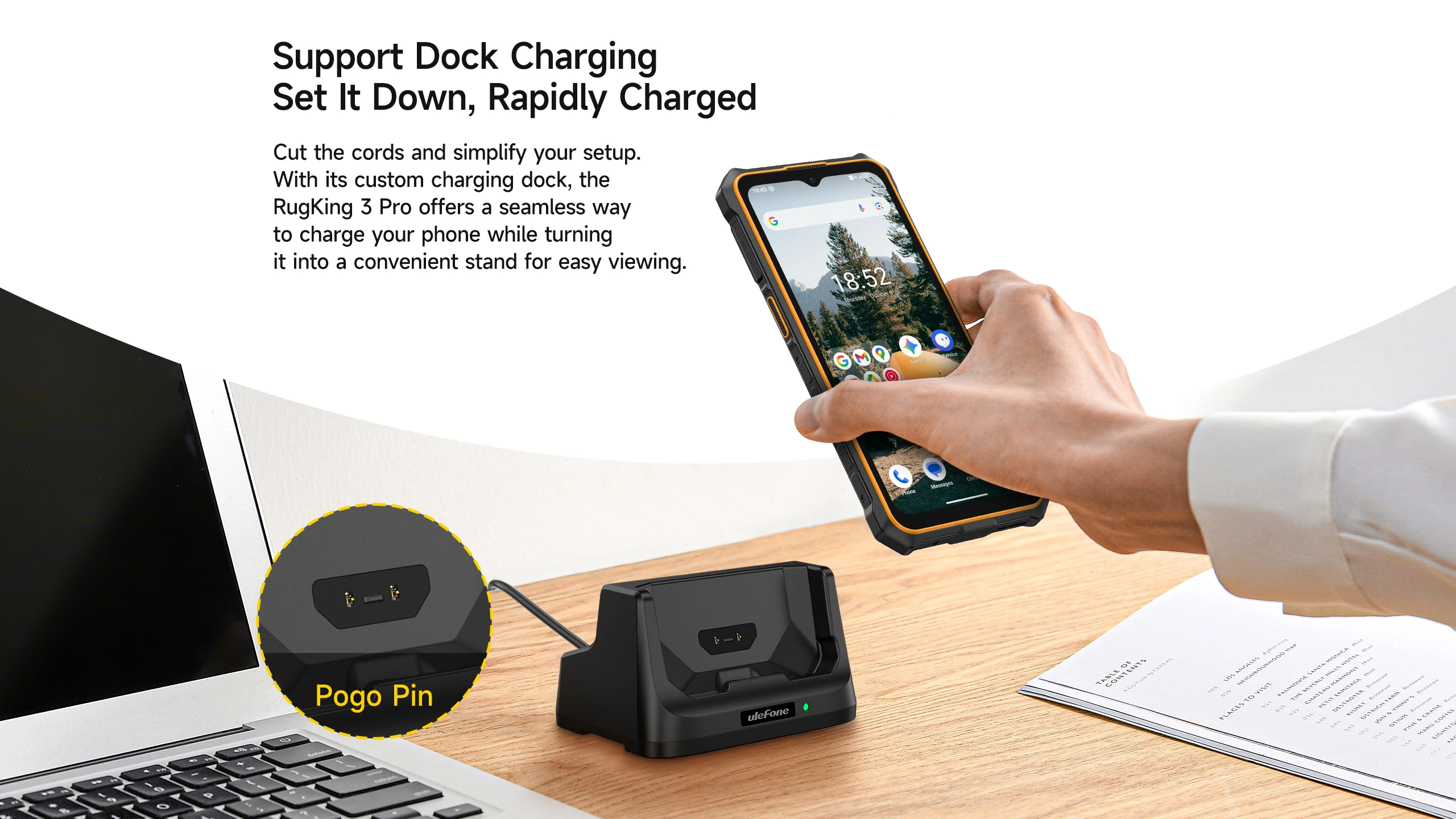 Cắt bỏ dây cáp và đơn giản hóa thiết lập của bạn. Với đế sạc được thiết kế riêng, RugKing 3 Pro cung cấp cách dễ dàng để sạc điện thoại của bạn đồng thời biến nó thành một giá đỡ tiện dụng để xem thoải mái.