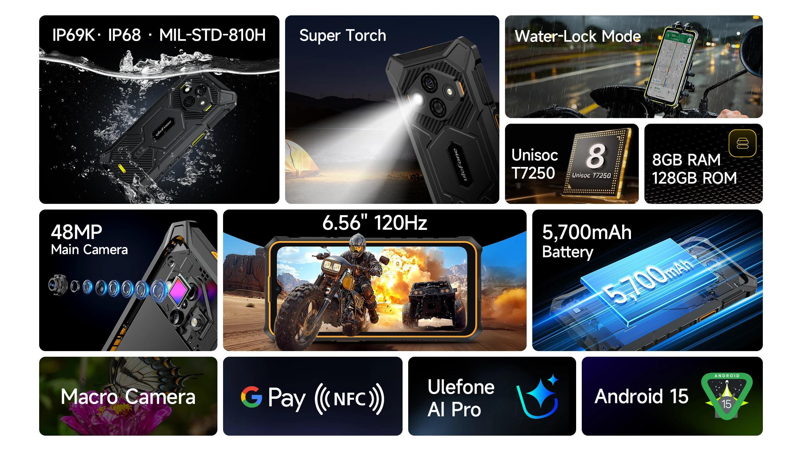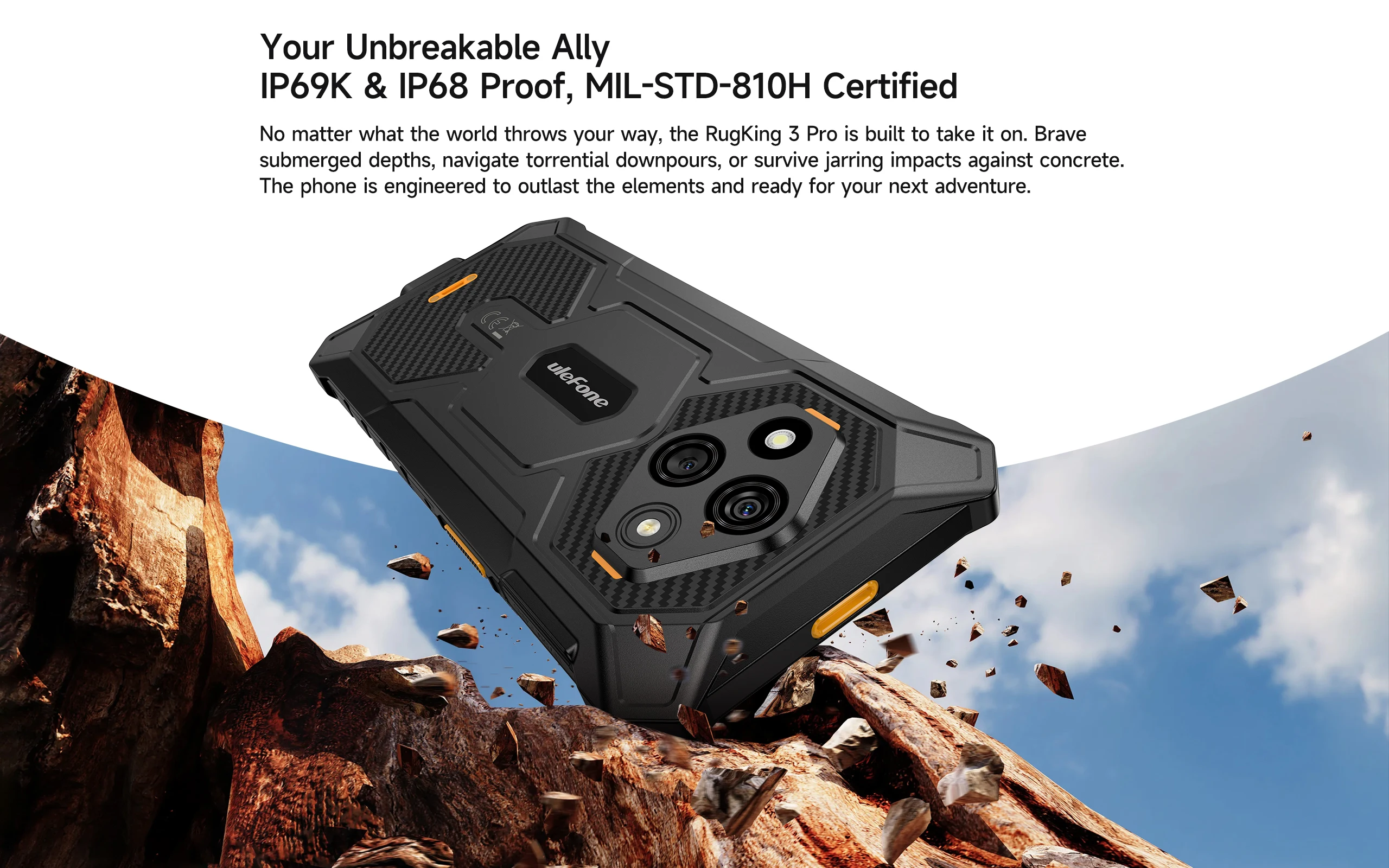 Ulefone RugKing 3 Pro, 8GB+128GB, Điện thoại bền bỉ IP68/IP69K, Android 15 Unisoc T7250 Octa Core 6,56 inch, Mạng: 4G, NFC, OTG