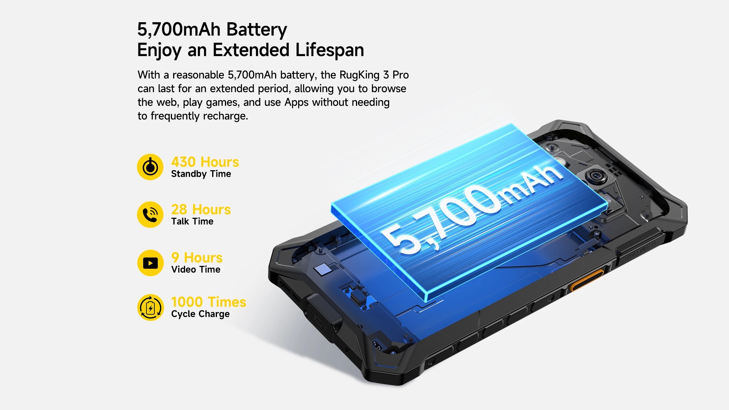 Với viên pin dung lượng lớn 5.700 mAh, RugKing 3 Pro có thể hoạt động trong thời gian dài, cho phép bạn lướt web, chơi game và sử dụng ứng dụng mà không cần sạc thường xuyên.